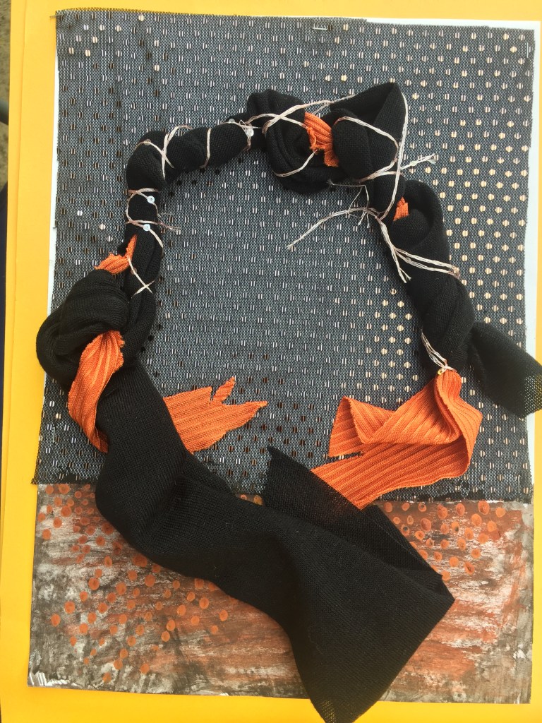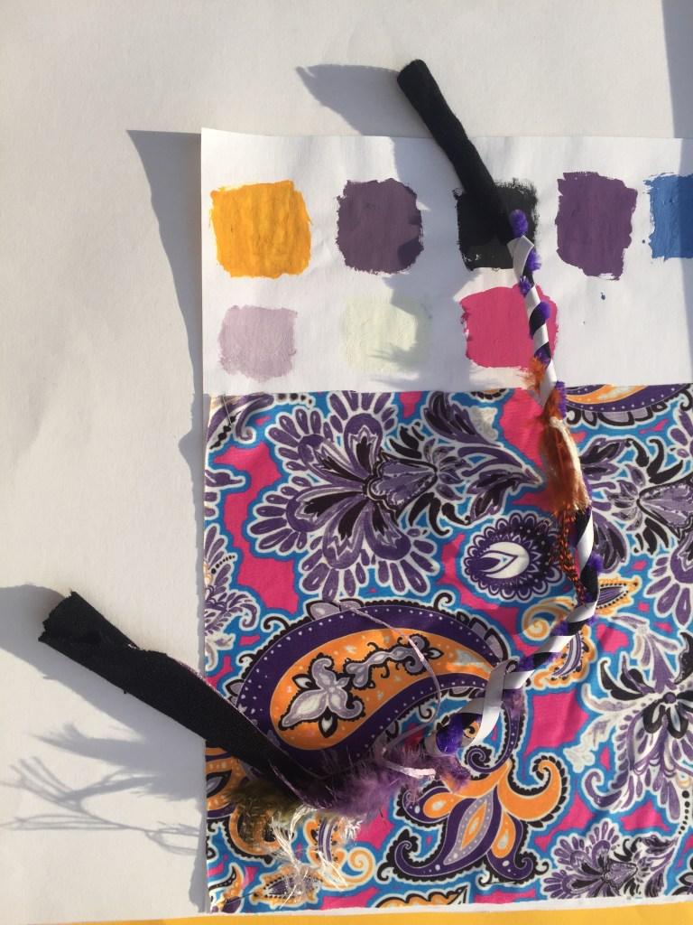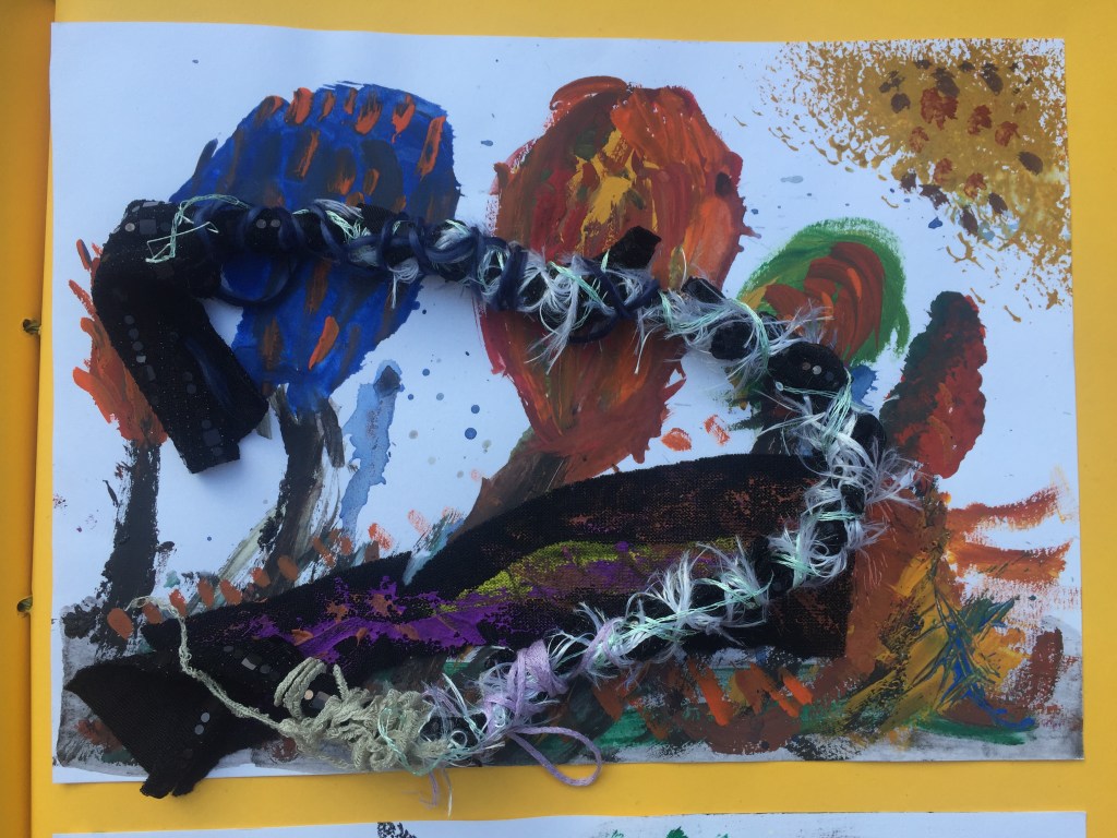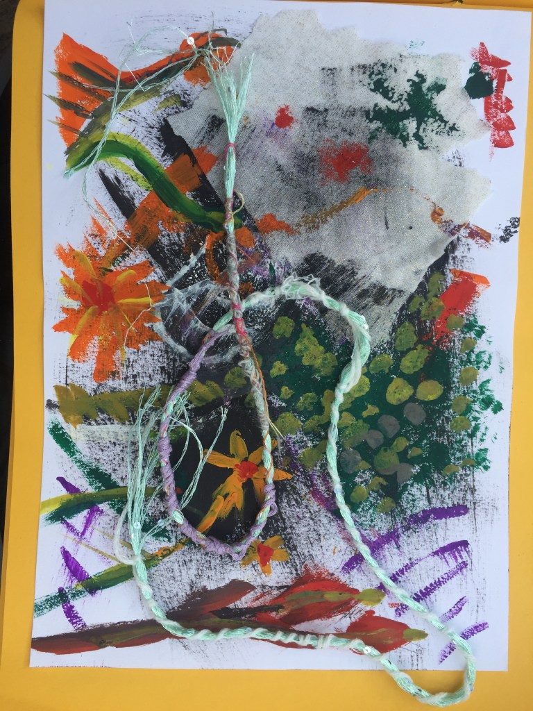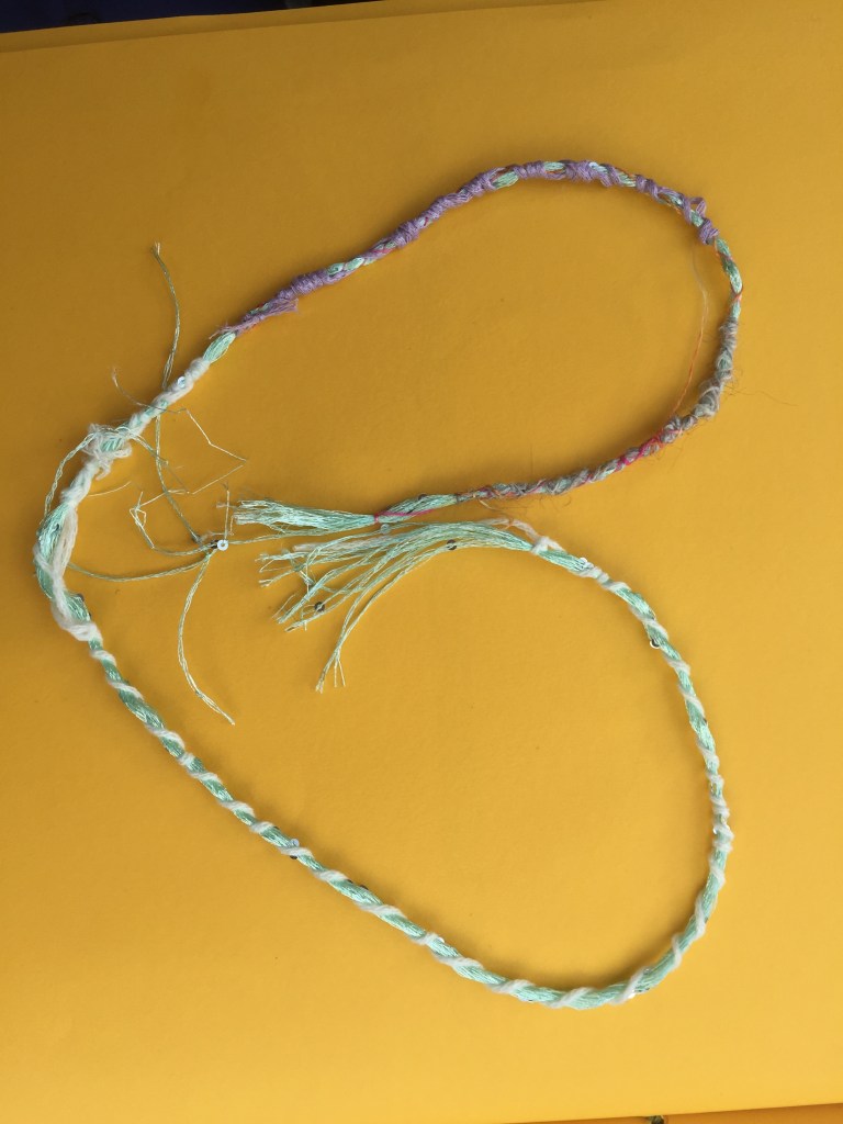 light green sequin yarn to match the greens on my painting complimented with purple tape and space due yarns.