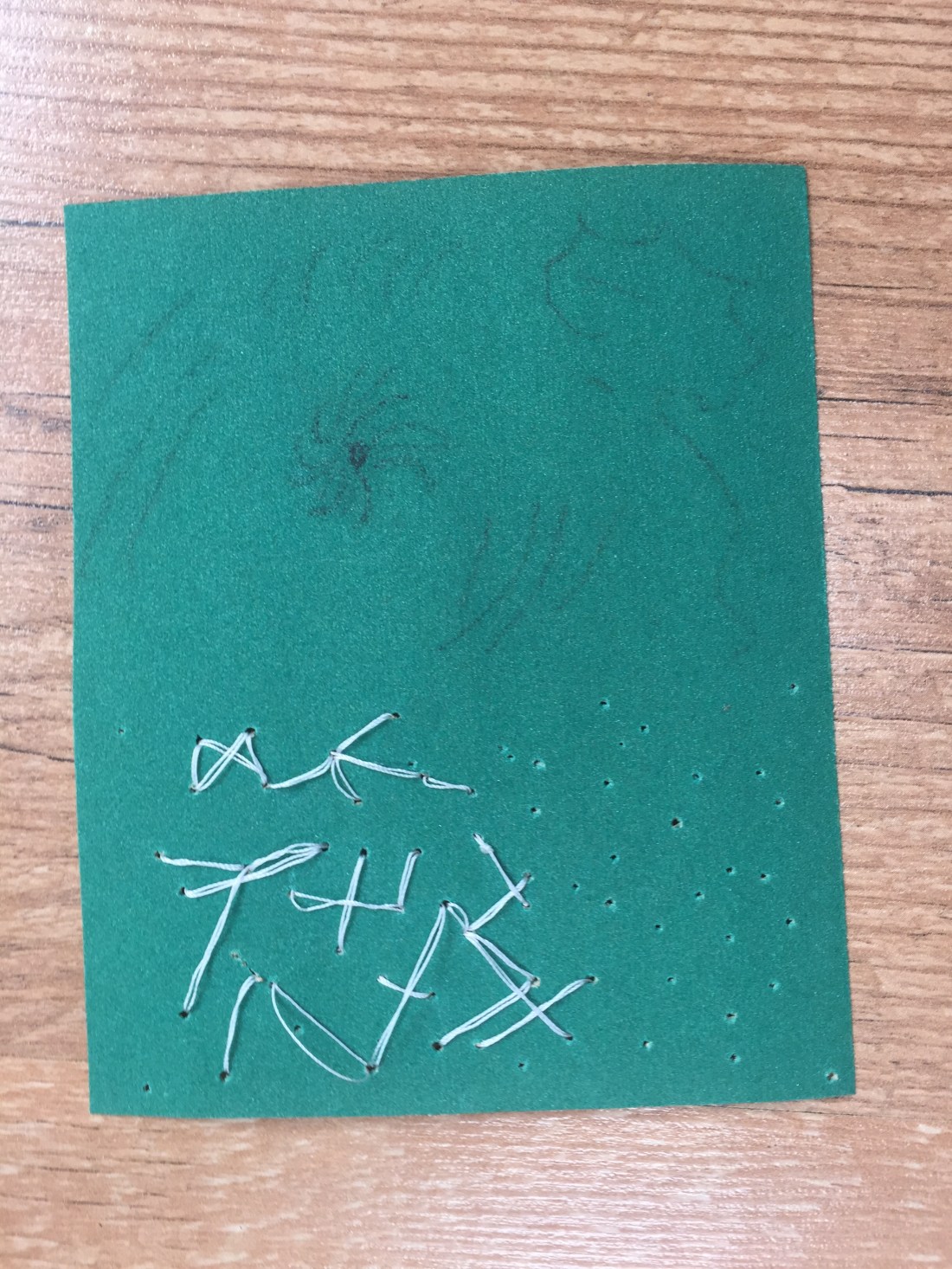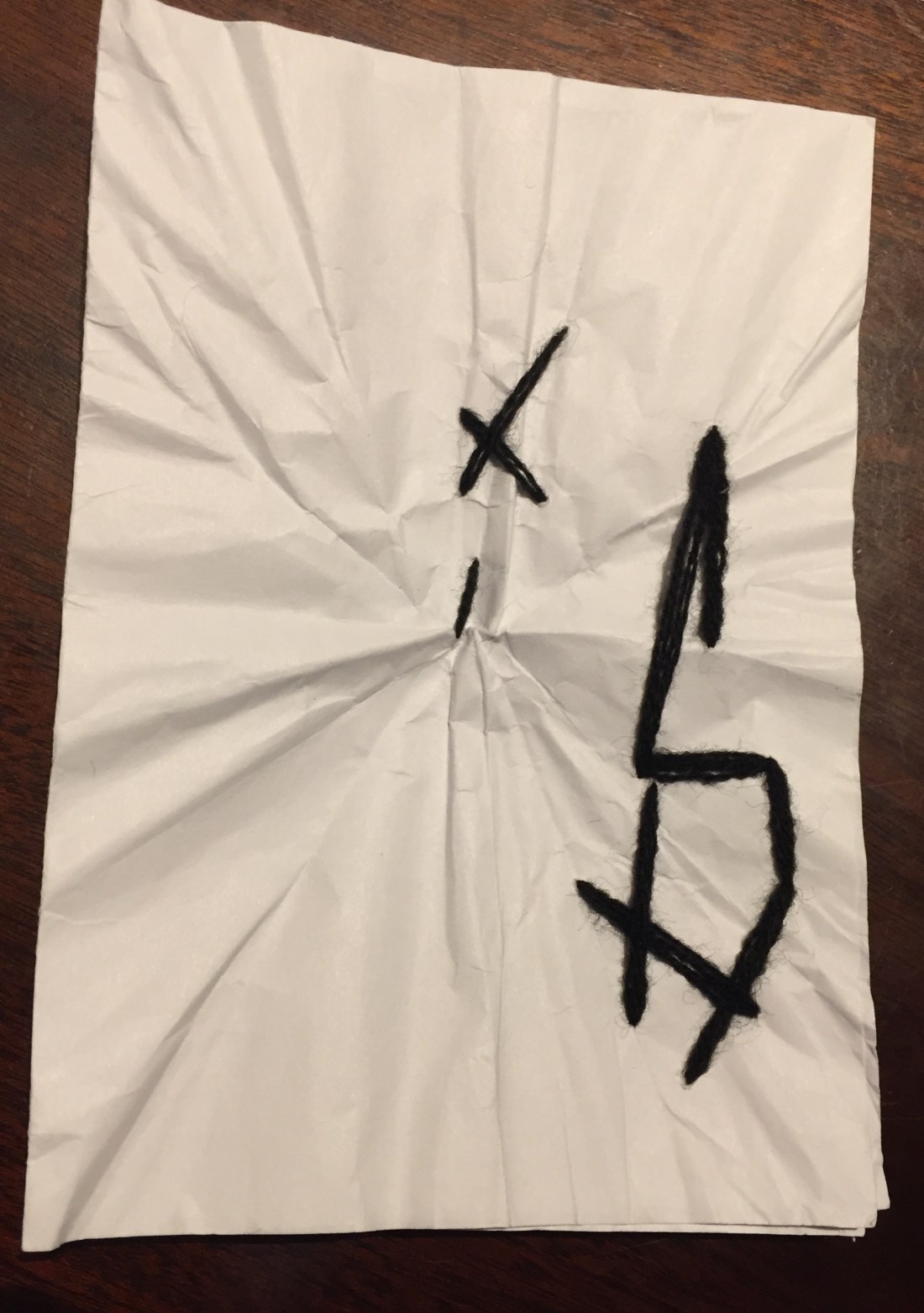 Black acrylic yarn stitched to secure the sandpaper and white tape yarn that goes through holes.