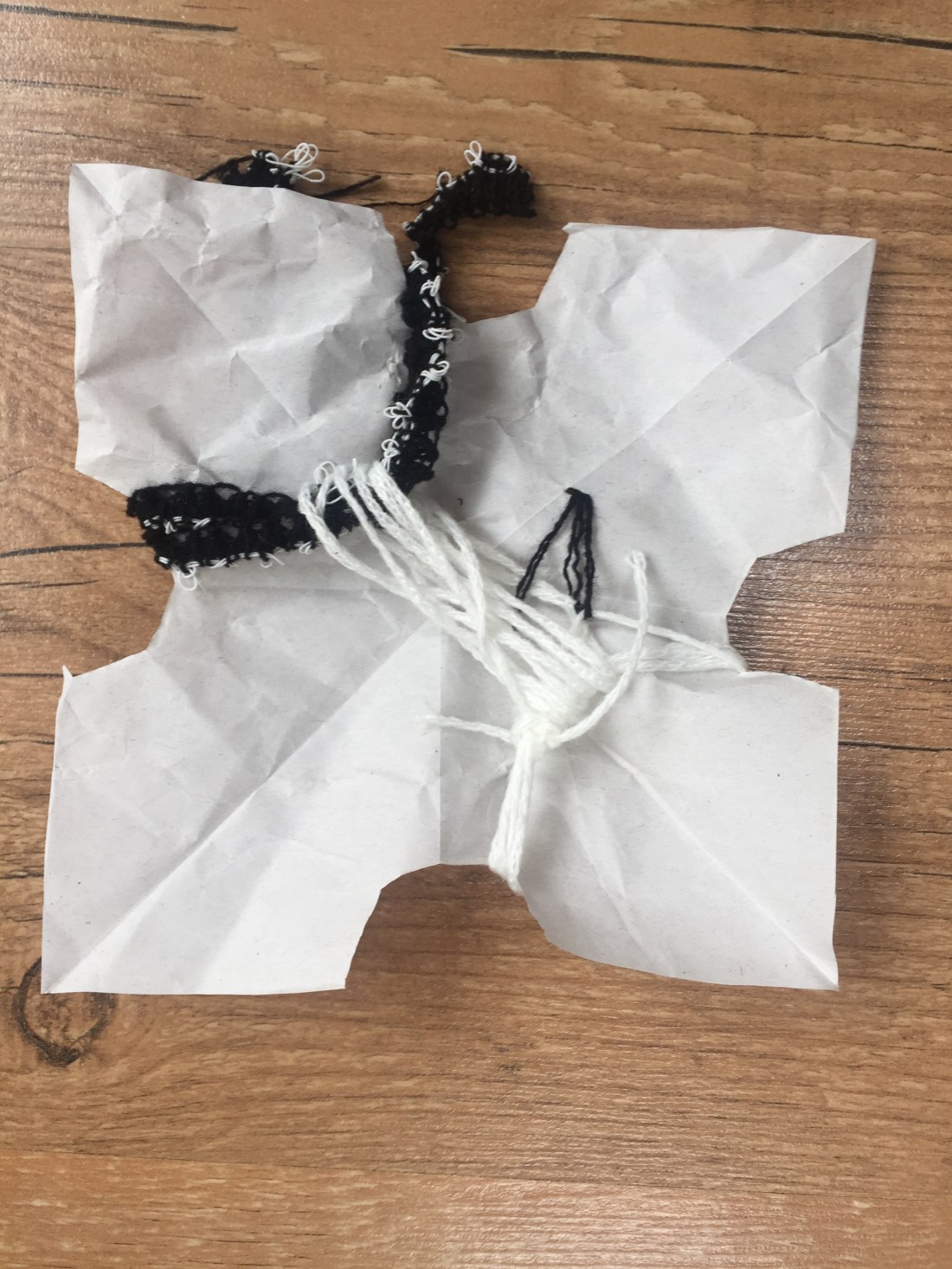 Ribbon, tape yarn, all stitched together on a delicate wrapping paper.
