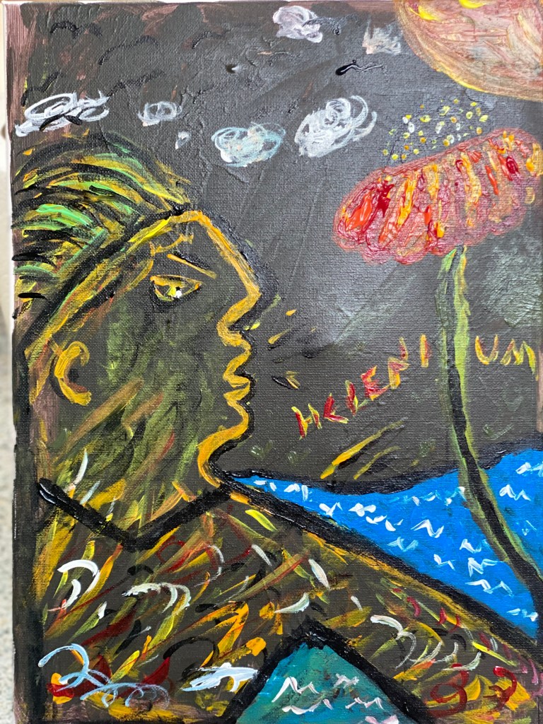 Later, I made a drawing of someone looking for Helen. It could be Eurypides’s Menelaus who went to Egypt after the Trojan War. It could also be someone like me represented in the painting on the quest of Helen. Like Homer, I did not give any shape to my Helen. I looked online and, to my surprise, there is a flower named after her: Helenium. Heleni-um is what the hero of my drawing shouts out when he sees it, having many seas under his sleeve.