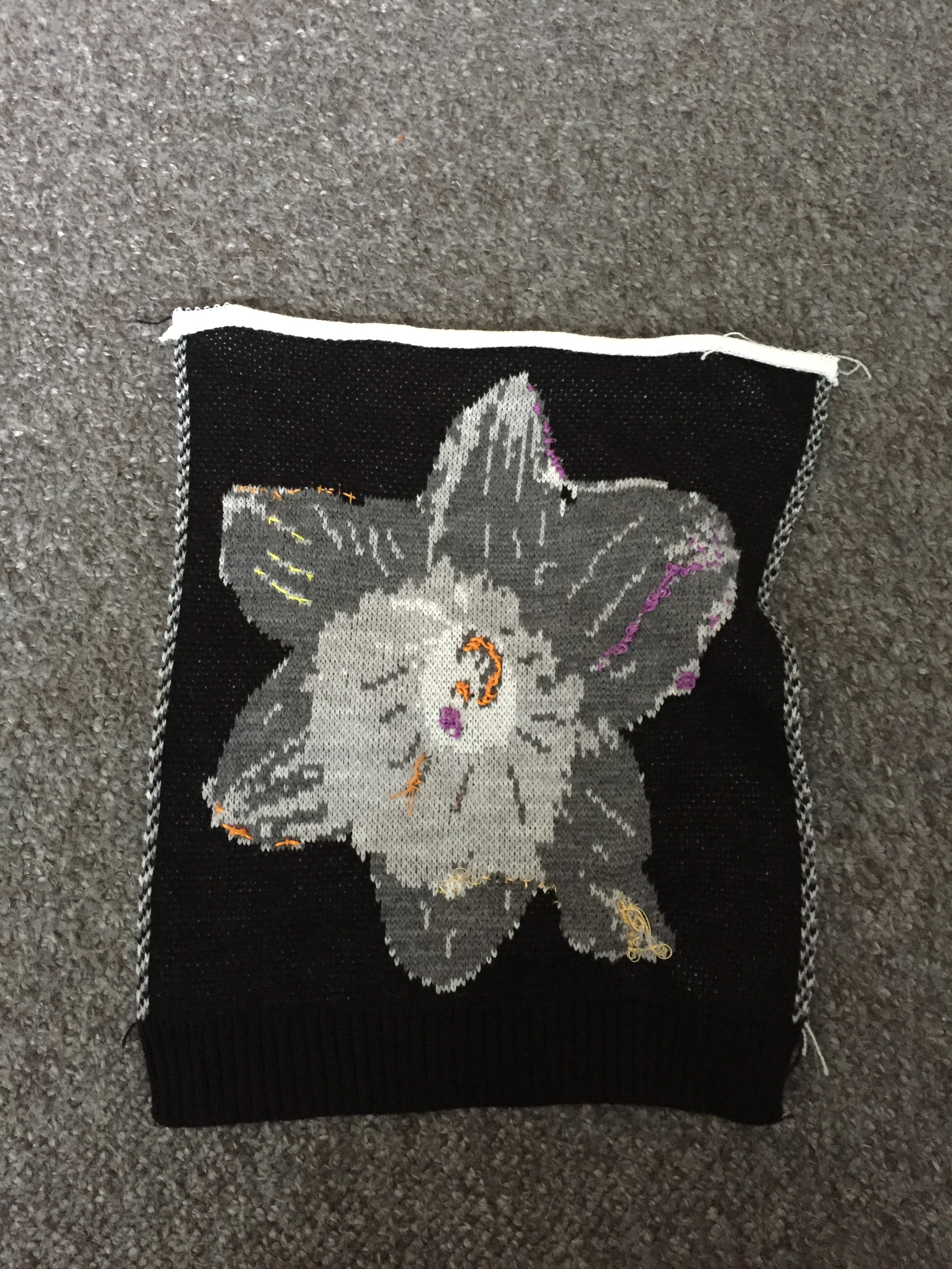 Knitted on a 10 gauge machine using my own graph and knitting program and then embellished by myself using embroidery yarn :