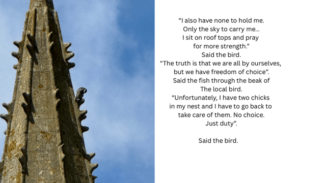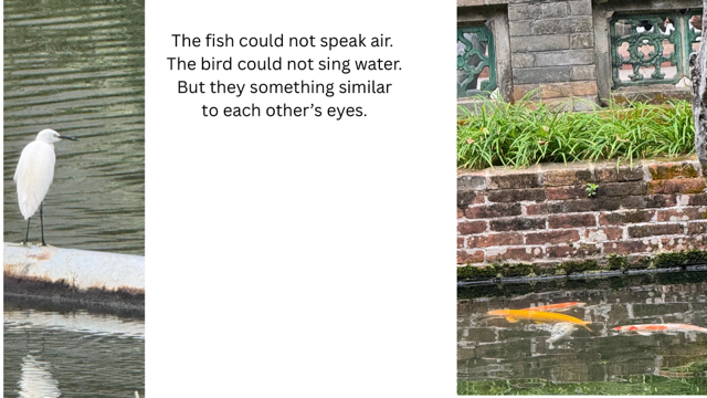| D | Dialogue (imagined) | In silence, there is communication. The bird and the fish speak in stares. I often write conversations that aren’t said aloud. |