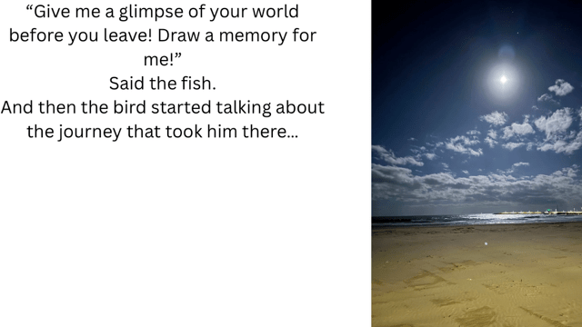 | N | Narrative arc | Even the smallest piece has a journey: a beginning, a middle, a transformation, and an end. My bird and fish evolve through their silence. |
