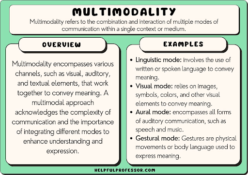 Multimodality incorporates a diverse range of channels, such as visual, auditory, and textual elements, which collaborate to convey rich and intricate meanings. Embracing a descriptive multimodal approach underscores the significance of integrating these different modes to vividly enhance communication and expression.