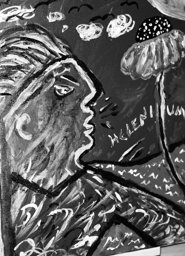 I have created the drawing in the form of a mask. A mask covers faces and hides people’s identities, qualities, expressions, and feelings.