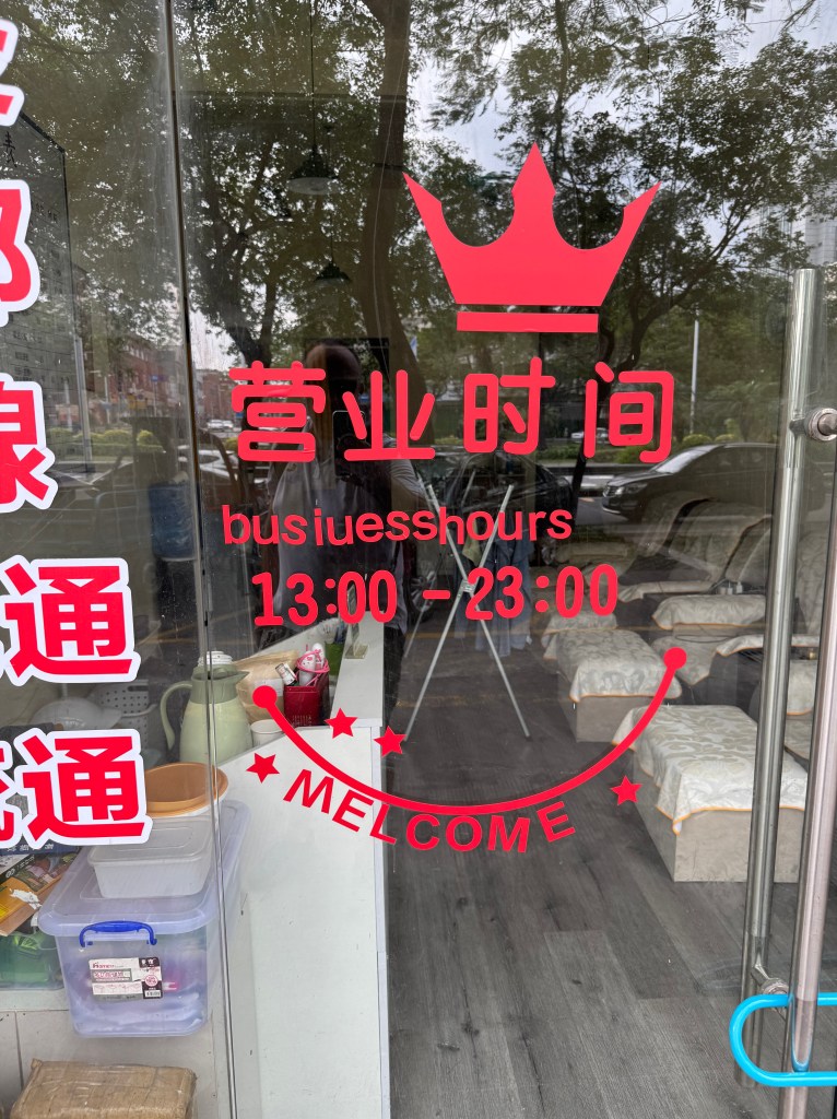 Another layer of irony I discovered during my time in China was in the “Chinglish” signs and posters I photographed. Many public signs, menus, and advertisements displayed English words assembled in ways that were grammatically broken or semantically meaningless. It felt as though the language was there simply to give an appearance of modernity or international style, rather than to communicate. For me, these fragments were humorous but also revealing: they showed how language can lose meaning when stripped of context, and how easily romance or authority can be punctured by accidental absurdity.
