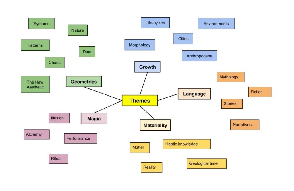 By mapping the connections between your practice and research you can discover unique and inventive relationships and new directions to follow further. This exercise involves you producing a visual representation of your research interests, as explored in project 4, incorporating connections between external voices to expand your own.