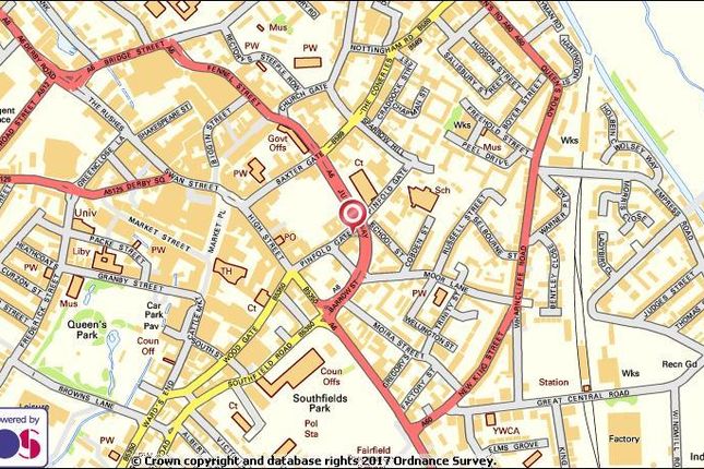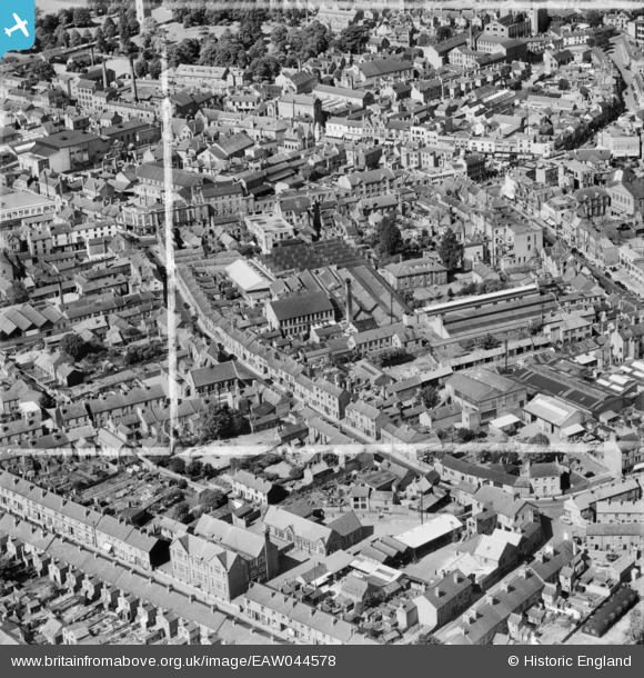 EAW044578 ENGLAND (1952). The William Cotton Ltd Knitting Machine Factory on Pinfold Gate and environs, Loughborough, 1952. This image was marked by Aerofilms Ltd for photo editing.