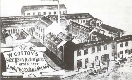 William Cotton invented the basic knitting machine movements used in modern equipment. He moved to this factory in Pinfold Gate, Loughborough, in the 1880s. The different buildings are identified in the engraving and include a forge, needle and sinker departments and several erecting shops.
