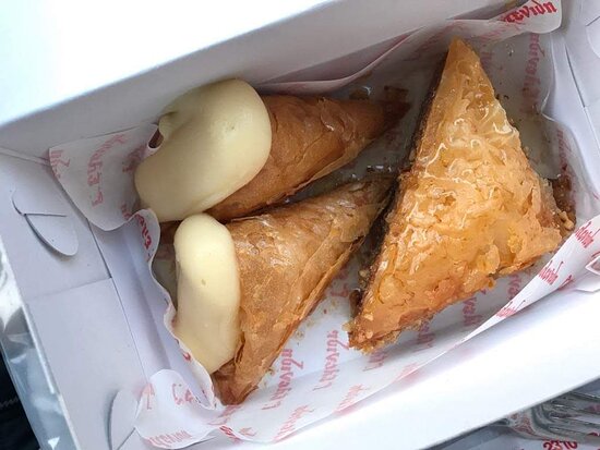 Delicious pastries with custard: trigona (triangle). Traditional sweet of Thessaloniki