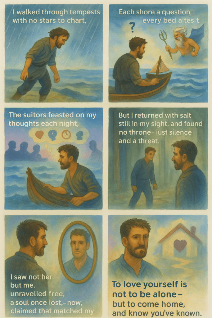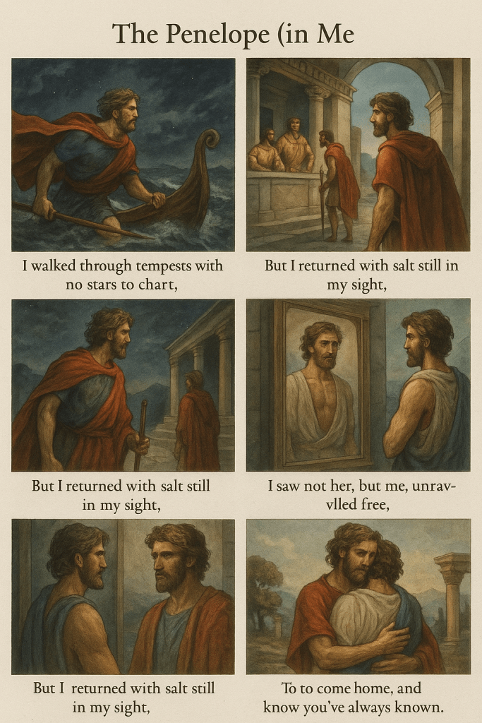 The first breakthrough came with the illustrated poetic sequence “The Penelope (in Me)”, which was initially a written poem about emotional exile and self-discovery. To push against my usual method, I recreated it as a visual narrative told through six sequential panels, where each stanza was represented through symbolic scenes. Using AI, I reimagined the visuals in three aesthetic styles: a monochrome, a more contemporary and internalised one, and the other drawn from mythical Greek visual traditions, referencing the neoclassical palette and symbolism of Odysseus’ return as portrayed in traditional Hellenic ceramics and frescoes (the last one came out with completely wrong wording but I kept it to signify the AI creation challenges).