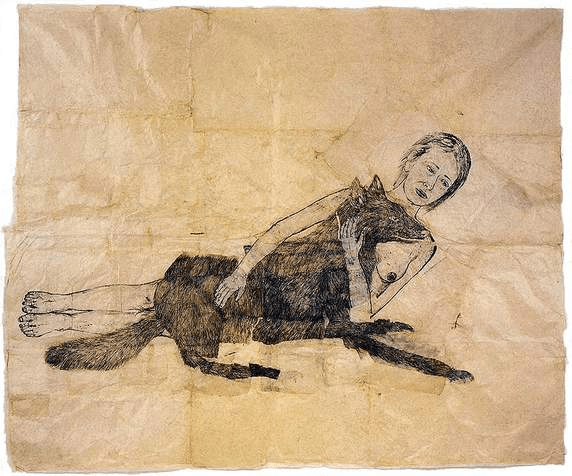 Inspired by the work of Kiki Smith, particularly her print series “Lying with the Wolf”