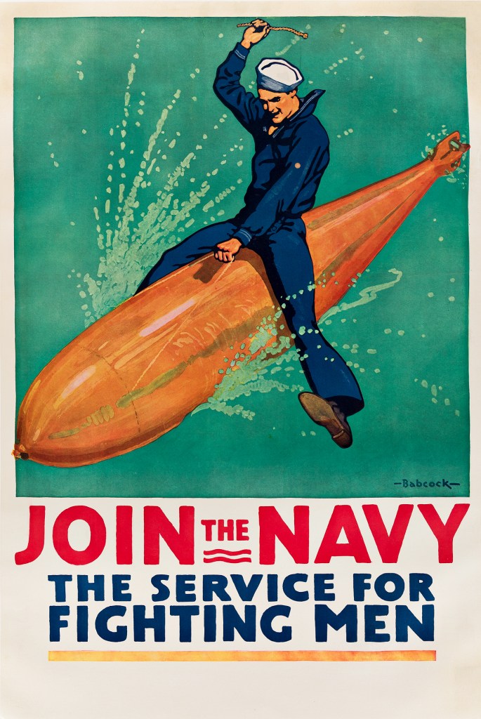- Noted the above, but what I first noticed when I looked at the picture, is a young man trying to tame a torpedo the same way he would try to tame a bull or a horse. He looks excited and seems from his body posture that he knows what he is doing: looks like he have done it before. Probably the navy recruitment forces are aiming through the poster for eager and capable American country boys to join the navy and live the thrill and the excitement of the experience as a whole. Yes, the torpedo looks like a giant phallic symbol: a phallus is the ultimate symbol of manhood. I think it was deliberately designed that way, just to encourage the young boys and make them become men through the American navy.