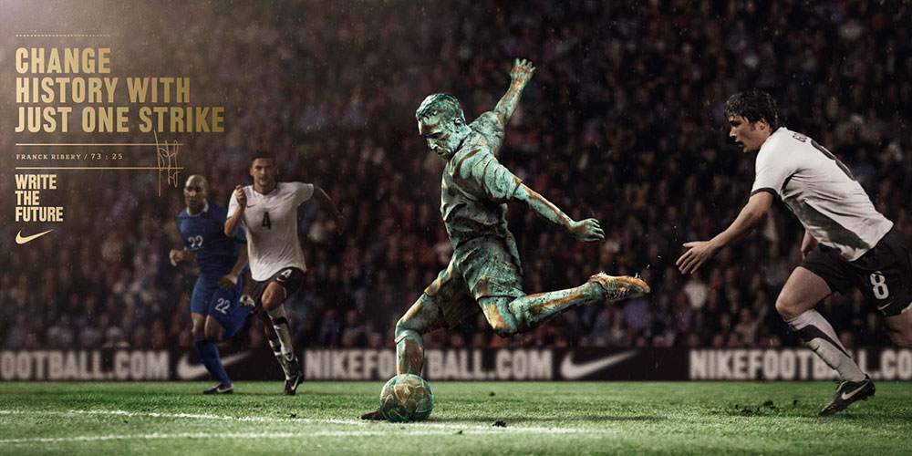 By turning the player into a statue, NIKE suggests that you can make history in football just with one strike, just with one shot. The footballer becomes a legend, he looks like a statue like the ones many football teams have in front of their stadiums representing their legends, their players who made a difference and stood out from the crowd. So according to NIKE writing the future is down to your effort, drive and eagerness to succeed.
