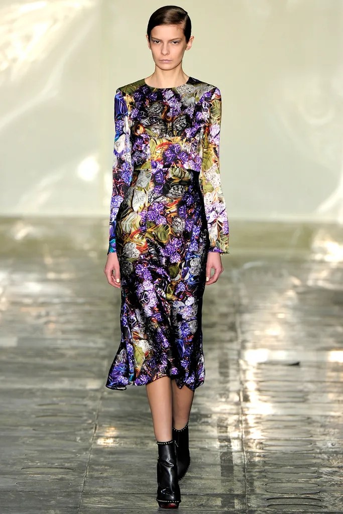 Last season, Mary Katrantzou’s tour de force of interior-exterior decoration put “the room on the woman.” So she said. This collection was more about “the woman in the room.” Stated the designer backstage today, “It’s more fluid, more real.” But the “more fluid” her “more real” got, the more you were left in the same jaw-dropped state of irreality that her Spring show had induced. That was mostly because Katrantzou imagined the woman as a connoisseur, surrounded by objects of beauty like Fabergé eggs, Meissen porcelain, cloisonné enamel, and Ming vases. And all of them were reproduced in hyper-vivid prints. The koi in one print were all but swimming before your eyes.
